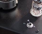 Single-ended triode amplifiers don't have much power output, especially if there is only one output tube. In this case, it is 5 watts per channel. That is why the tube chosen for this product is 6550, which allows the choice of using it in triode mode, or tetrode mode. A toggle switch on the chassis is used to change it from triode operation to tetrode. To do this, you power it off first, then switch it, then turn it back on. The switch is marked "T" for Triode and "P", because two "T"s would be pretty confusing. However, the "P" will have to stand for "Beam Power", because the instruction manual mistakenly calls it pentode. A photo of the toggle is shown at left.