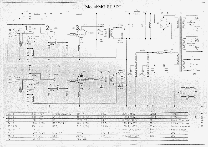 and power amplifier. The table at the bottom of the schematic lists them all,