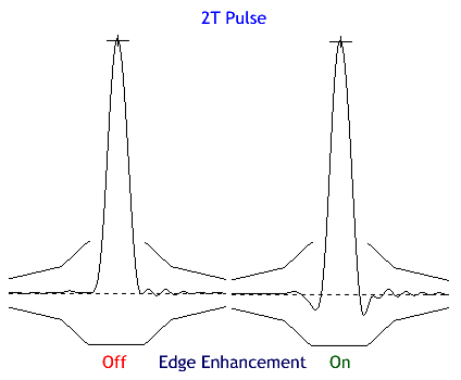 We are also including a 2T pulse, which we did not have available to us in our first DVD benchmark. The 2T pulse allows us to measure the amount of ringing a player has. A CAV 2T pulse is shown below. The pulse on the left is with the enhancement turned off, and the pulse on the right is the enhancement turned on. You can see the overshoot in the right pulse, and this is the ringing you would see in the image.