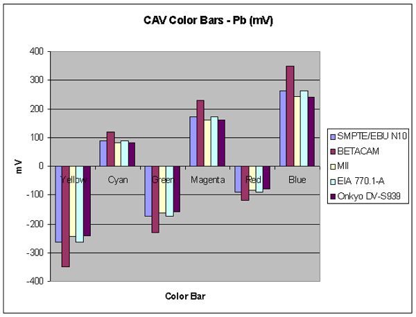 The Pb portion of the CAV output is matches the MII levels. The Pr portion of the CAV output matches the SMPTE and EIA levels.