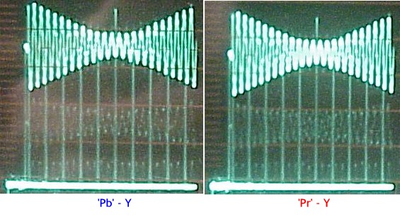 Ignore how fat or tall the line is in the middle. This is the amplitude of Y to 'Pb' and 'Pr' (the level difference is not important here). What you want to look at is where it lines up in the center. The first generation progressive DVD players often had poor CAV timing, but as you can see, the Onkyo has excellent progressive channel timing.