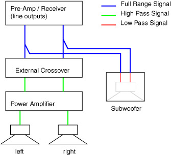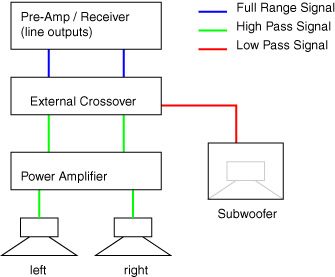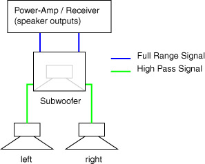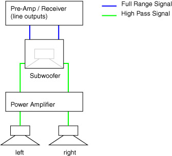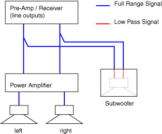 Option 3 (diagram below) assumes you have a subwoofer with speaker level inputs. This signal comes either from your receiver's speaker outputs or your amplifier's speaker outputs depending on which solution you're using. Take the left and right speaker level outputs into the subwoofer's speaker level inputs. Set the crossover on the subwoofer where appropriate for the mains you're using (80 Hz is usually a good choice). Take the speaker-level outputs (sometimes labeled High-Pass Output) to your left and right speakers. Depending on the location of your subwoofer relative to the other components of your system, you may need to purchase up to four new runs of speaker cable. Remember that the high-pass out to the satellites is usually a fixed frequency with most subwoofers, regardless of what you set for the low-pass frequency.