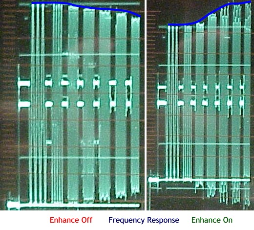 We have also included a digital photo of the progressive output frequency response. The image on the left is with edge enhancement off. You can see that it has a small roll-off. The image on the right is with edge enhancement on.