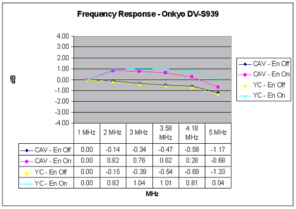 We are including both a video frequency response and a 2T pulse for the Onkyo DVD player. We made measurements with the edge enhancement set to "On", which is the default position, and to "Off, which is our preferred position.