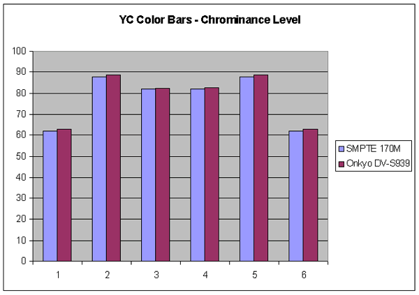 The chroma level is just a hair higher than SMPTE 170M. The Chroma phase of the YC output is virtually perfect.