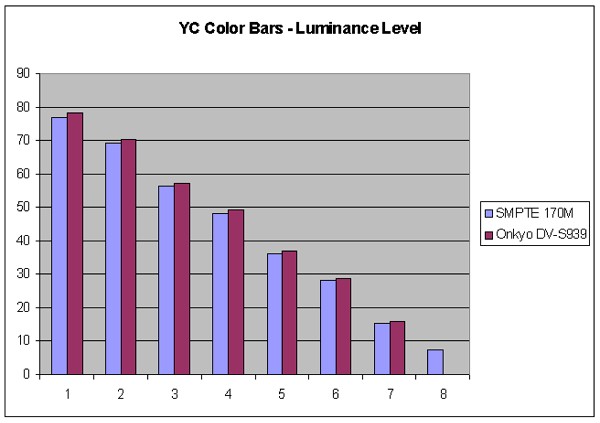 The Y level of the YC output is slightly higher than SMPTE 170M, except for black, where its low.