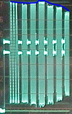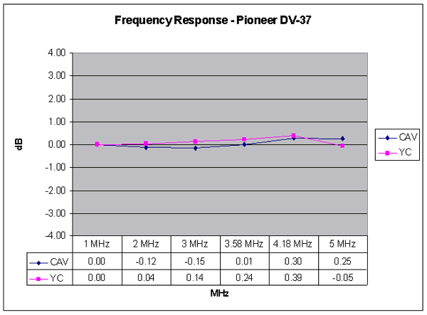 We have also included a chrominance frequency response. This pattern goes out to 2.75 MHz. The CAV chroma channels are capable of 3.375 MHz. The Pioneer is flat out to 2.75 MHz. This is what is expected from the CAV outputs of a DVD player.