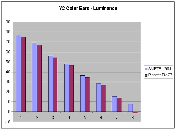 The Y level of the YC output is slightly lower than SMPTE 170M. Black actually dips into the negative range.