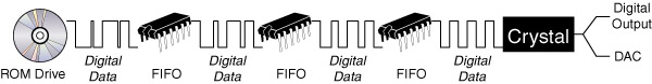 There are three FIFO buffers in the 800. The first FIFO exists in the 186 processor, the second is in the MPEG decoder, and the third is on the digital input card. The first two FIFOs are small compared to the last FIFO that does majority of the work. Why are three FIFOs used? It all goes back to the reason Meridian chose a ROM drive.