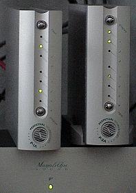Below is a photo of the P-1A and P-3A settings that I used. The P-1A is on the left. The lights indicate the XLR input (top green light) and speaker correction activated (bottom green light). The P-3A on the right shows absolute phase (top green light), input signal locked and 96 kHz sampling (second green light from the top), and XLR input (third green light from the top). I had also selected 44.1 kHz sampling and 24 bit word length on the P-1A, but those are not indicated by the lights.