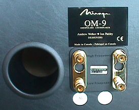 The OM-9s have a 1" tweeter and 6 1/2" woofer on both the front and rear baffle. The rear baffle slopes from top to bottom, going from a 6" measurement at the top to 12 1/8" at the bottom. The result is a very sleek and elegant design that put it at the top of the list of great looking speakers. The OM-9s come in two finishes: piano black and cherry wood (which looks very light at first, but may darken over time). The piano black finish costs $100 more than the cherry finish in the OM-9 speakers at $1,300 ($200 more for the piano black finish in the OM-5 and OM-7 models because they are larger).