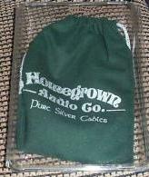 Frankly, some of the experience of buying audiophile cables has to be the "out of the box experience" - I've seen some audiophile cables packed in better boxes than an engagement ring! Homegrown doesn't go that far, but the presentation is very nicely done. Each interconnect pair is packaged in a clear plastic carton, and is put into a nice green felt bag, with the Homegrown Audio logo, done in silver of course! The terminations are custom made locking RCA connectors. The "Silver Lace" heatshrink tubing includes a RED directional arrow on one cable, and a BLUE directional arrow on the other cable of the set.