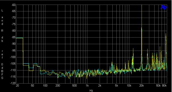 With the DACs playing nothing (silence track on the DVD), without AC filtration or regeneration, you could consider the noise floor of this player fair, but nothing to jump up and down about. Not too bad, but not great. Many of the components lay as low as –135 dB, though there were substantial peaks at 60 Hz, 180 Hz, and 240 Hz from powerline components, as well as more minor peaks near and above 20 kHz.