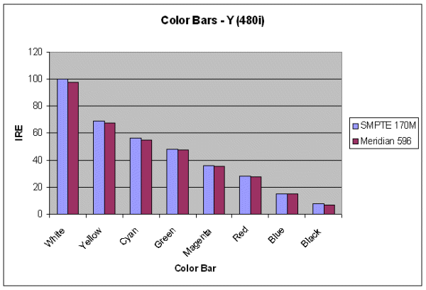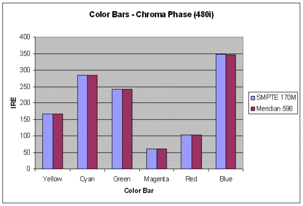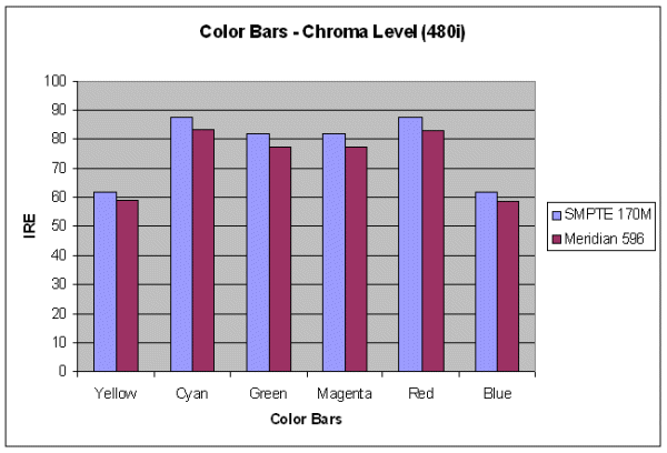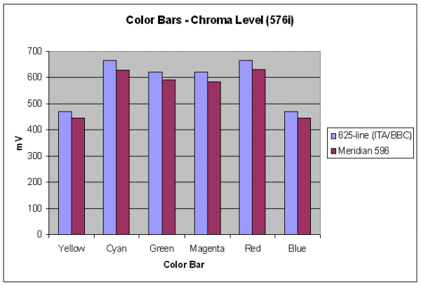 Below you will find several bar graphs that show known standards for NTSC and PAL as well as where the 596 sits relative to them. The reason for these graphs is to show the many standards and the fact that no two players have the same levels. We are really trying to emphasize that if you change DVD players, you must re-adjust contrast, brightness, color, and possibly tint. If you do not, you will be fooled into thinking one DVD player has more saturated colors than another. This simply is not the case. All DVD players should output the same color saturation, and if not, you have not properly setup your display with your DVD player using color bars and a PLUGE pattern. This is a mistake that is sometimes made by consumers and reviewers alike.