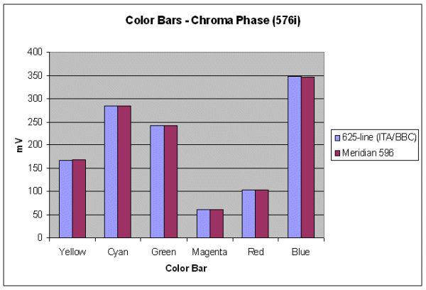 The 576i output is relative to the 480i output in reference to the appropriate video standard. Luma is a little low as is the chroma level. You should be able to compensate by using the contrast and color controls on your display device. Chroma phase is where it belongs.