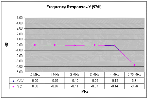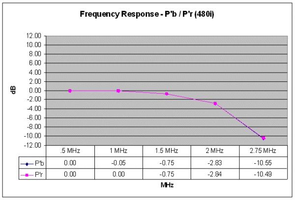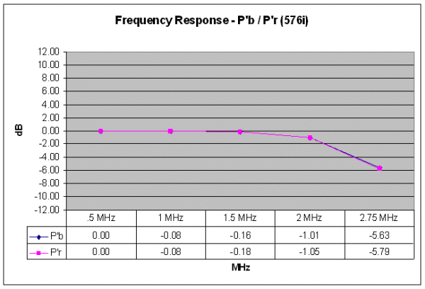 You will notice below that the Y frequency response for both 480i and 576i are pretty close in results. The big difference is on P'b and P'r. The 576i output has half the roll-off as the NTSC outputs.