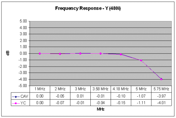 The Y frequency response of both the S-Video and CAV outputs track each other well. The response of the 596 is flatter than the 800 DVD machine at 5 MHz. This results in a slightly more detailed picture as this is the area of fine detail. You will see that the video frequency response begins to drop off quickly after 5 MHz. This is expected behavior.
