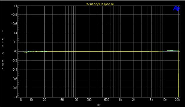 The 596 output had average levels for the players tested with left and right output and 5.838 dBV and 5.819 dBV respectively. For what it's worth, the player's output was one of the most closely matched between channels, which says good things for manufacturing tolerances.Audio Frequency Response