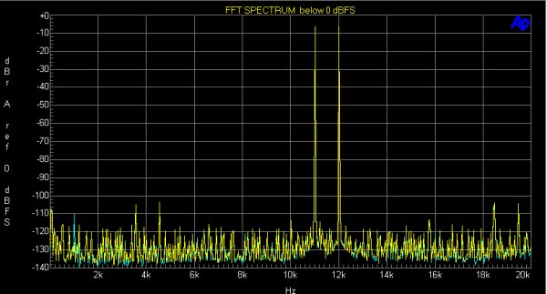 The distortion spectrum playing the 1 kHz test tone was quite good, with only the 2nd and 3rd harmonics visible above the noise floor. The third harmonic was just slightly higher than the second, but still lower than –100 dB, while the second sat at –106 dB.