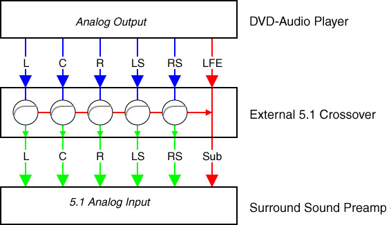 The simplest configuration assumes you are using the same speakers for the Chesky and MDG surround setups. It requires a two-way switchbox, with output A handling standard 5.1 setups and the Telarc height channel. During 5.1 listening, no signal will be present on the 6th channel. For Telarc height, the subwoofer line level cable would need to be connected to the 6th channel amplifier input. A switchbox could be employed for this as well.