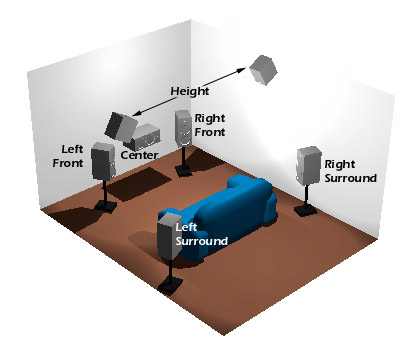 We'll start off with the easiest of them, the Telarc height channel. In the Telarc configuration, you begin with the standard 5.0 speaker layout of Front L/R/C and Rear L/R. The subwoofer channel is reallocated to the height channel (Figure 10a). The height channel has two potential solutions. A single channel can be located directly above the center channel for a 6.0 solution.
