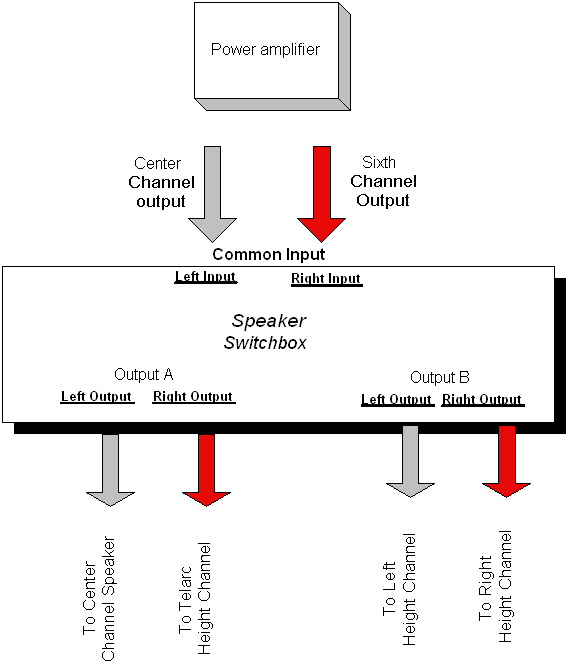 Figure 14 Two-way Switchbox If you want to start getting really serious about this, you could dedicate separate speakers (or at least speaker wires) to the different configurations. In this case you need a three-way speaker box. Output A would be for 5.1 and Telarc listening, with the Telarc height channel inactive for 5.1 listening. Output B goes to the Chesky height channel speakers, and Output C goes to the DMG height speakers.