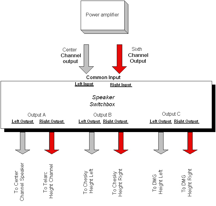 Figure 15 Three-way Switchbox Of course as a reviewer I can't do things that straight forward, so I'm (JK) legally required to make things vastly more complicated in my system (only kidding). In my system, I have an unpowered subwoofer, and my 6th amplification channel drives the subwoofer for 5.1 listening. To fully do all the height options, I'd have to go to a four-way switchbox. The outputs in my system would be as follows: Output A for 5.1 listening with the left channel connected to the center, and the right channel connected to the subwoofer. For Telarc listening, I'd use output B, with the left channel going to the center and the right channel going to the height channel(s). For Chesky Listening, I'd use output C, with the left channel going to left height, and the right channel going to right height. For MDG listening, I'd use output D, with left channel going to left height and right channel going to right height.