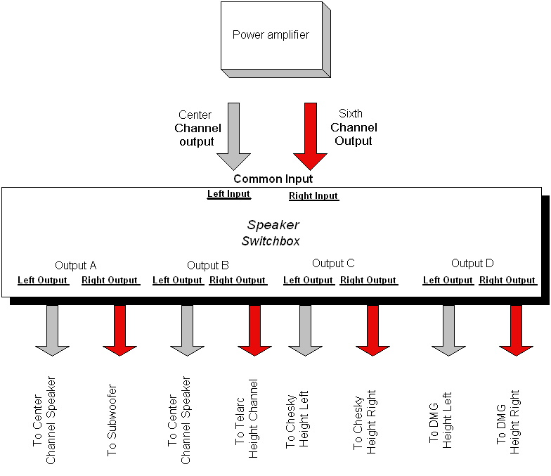 In all cases, the speaker level outputs for the CC (5th) and the 6th channel will go to the switchbox common inputs, left and right respectively.