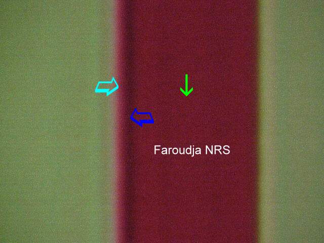 You can see that the NRS performed admirably. There is some Pb to Pr delay as shown in the photo below. The light blue arrow points out a thin red stripe along the left edge, followed by a black stripe (blue arrow) and then the rest of the red band (green arrow). The NRS also has YC delay, where the black stripe would not have the red stripe to the left of it. But, until the Pb to Pr delay is fixed, YC delay is not visible. Sage is working on an update that will correct this.