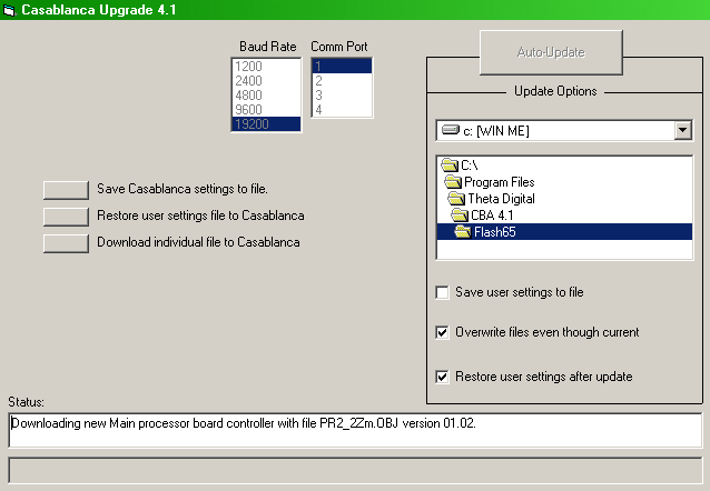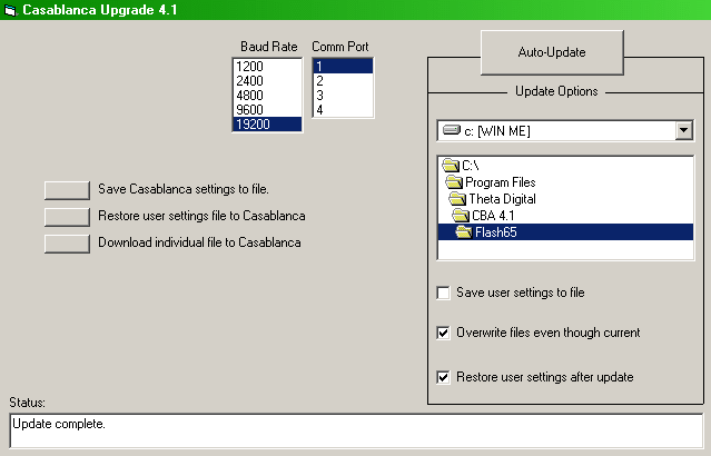 Note the Flash65 folder under the CBA 4.1 folder. CBA 4.1 is the latest version of the application that runs on your PC, and Flash65 is the update that gets transferred to the Casablanca through the RS232 port. So, all I had to do was connect a DB9 serial port cable (don't use a null version of the cable) on a serial port of the PC and the RS232 port on the Casablanca, and click the Auto-Update button on the program (top right corner of the screen). The status bar (bottom of screen) said it was communicating and then downloading. At the end, I saw this screen (photo below). The update was complete.