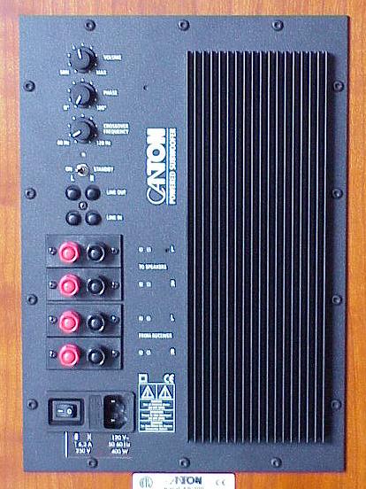 The subwoofer has two 12" drivers, one active and one passive. They are on opposite sides of the enclosure, with the power amplifier controls (shown below) in between. The close-up photo on the right illustrates the usual controls, including volume, variable phase, and crossover frequency. There are two power-on controls. One is the main power rocker switch at the bottom left, and the other is underneath the crossover frequency knob, which is for power always on vs. standby. There are some small plastic plugs in each of the sockets (RCA and speaker). You have to remove them from the sockets you are using, but just leave them in the ones you are not using. This keeps the sockets from accumulating dust. Nice touch.