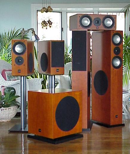 The M 80 DC (Floor-Standers) and CM-7 (Center Channel) are MTM (Midrange - Tweeter - Midrange) configurations, also called D'Appolito (after Joe D'Appolito, who originated it). This places the high frequencies coming from the center of the midrange. The M 30 DC has the midrange driver on top, the tweeter underneath, and the woofer (8") on the side. The M 80 DC also has its woofer on the side, but it is a 10" driver. The M 80 DCs and 30 DCs are marked as "A" and "B", which indicates that the woofer is on the left or right side of the enclosure. I set them up with the woofers facing each other, rather than away from each other.
