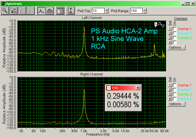 Harmonic distortion spectra, shown below, indicate a higher than average amount of distortion. Again, this is typical of low-negative feedback amplifiers. A second function of negative feedback is to lower the total amount of distortion. That is why mass market receivers have low distortion specifications. Lots of negative feedback. The problem is that, when negative feedback is overused, it increases the amount of higher-order odd-ordered distortion (7th and 9th for example), which gives a harsh sound. That type of use has given negative feedback a bad name. Proper use gives detail to the sound a bit more edge, but not irritating. The HCA-2 has the detail, but it is not as noticeable. Amplifiers that use proper amounts of negative feedback have the same amount of detail, but it is a little more forward, more noticeable. It all depends on design goals and personal sound preferences of the consumer. I tend to like the warm and fuzzy sound of tubes, and of something like the HCA-2. The use of negative feedback reduces the gain, so amplifiers with negative feedback tend to have more gain stages. The HCA-2 doesn't use much negative feedback, so only two gain stages are necessary.