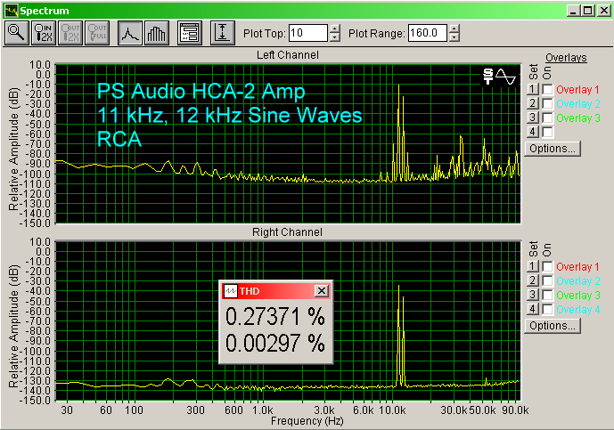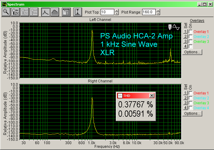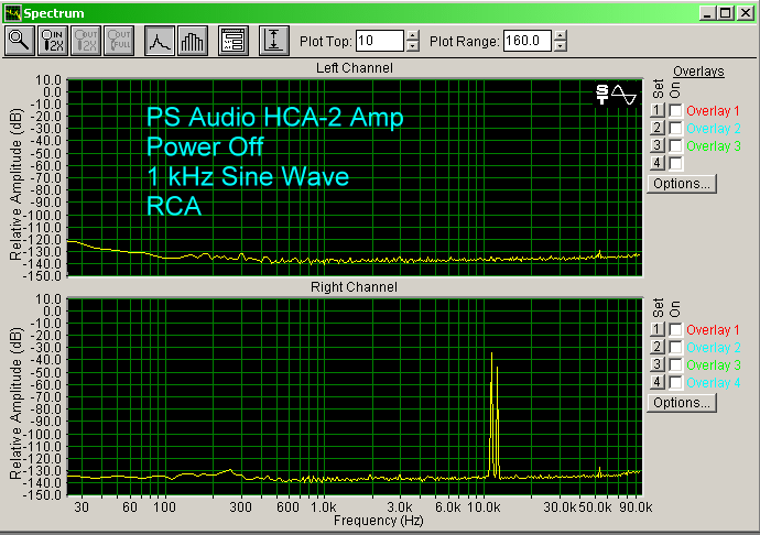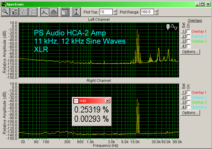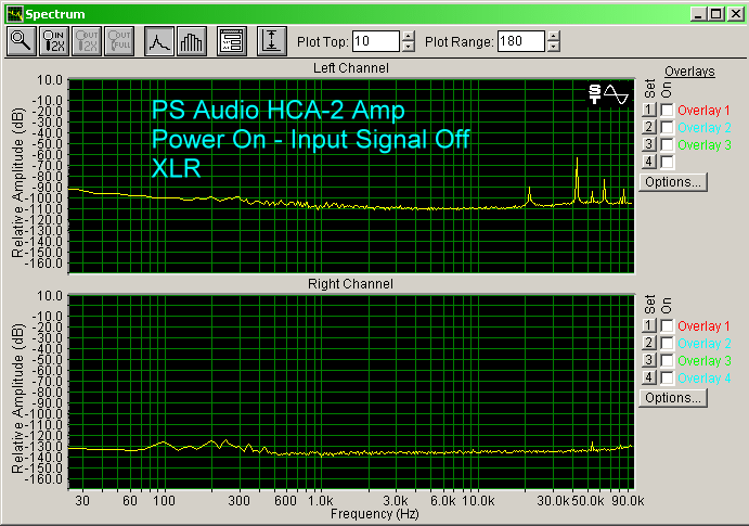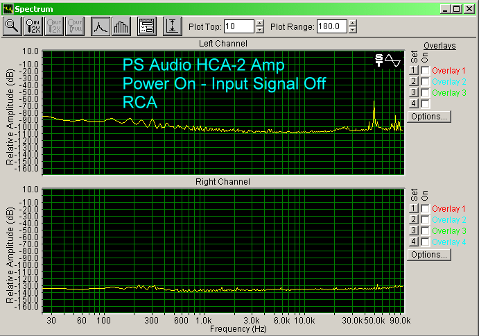 The HCA-2 has a modest noise floor, as shown below. It is about the same with the RCA input or the XLR input (XLR a few dB lower), and about 30 dB above the control shown in the pass through right channel. Interestingly, each input had different noise peaks from the other. I could hear a soft background noise, like someone exhaling through their mouth, when I put my ear up to the tweeter. But, moving even just a foot away from the speaker, I could not hear it.
