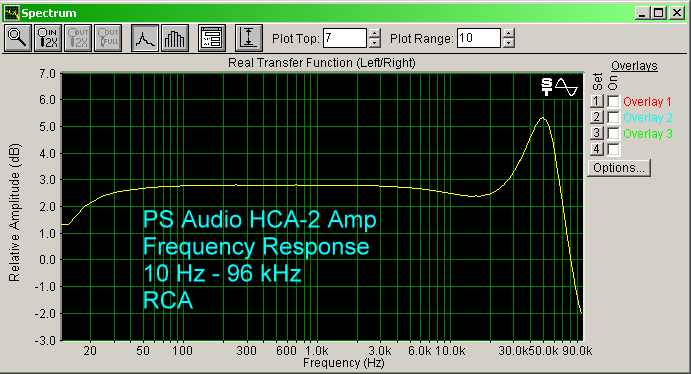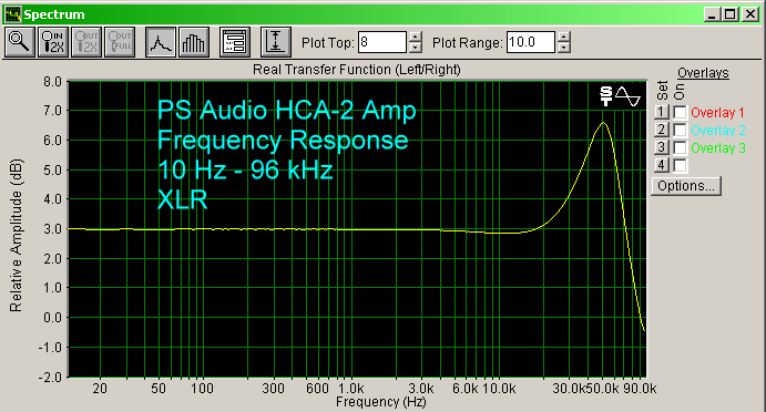 Measuring the frequency response, I found that it is really not very flat. In fact, there is a peak at 50 kHz. The overall response is flatter using the XLR inputs compared to the unbalanced RCA inputs (graphs shown below), particularly in the deep bass region. The peak is one of the things that can happen when you don't use negative feedback. In fact, flattening the response is a major reason negative feedback is used. A high frequency peak like this one at 50 kHz can result in parasitic oscillation that occurs with loads (speakers and cables) that have significant reactive impedance. This is another reason I wanted to use the HCA-2 with planar speakers, which are notoriously reactive loads. However, the HCA-2 performed flawlessly. A big power transformer in the HCA-2 may be the reason. They can handle reactive load problems. Once we see digital switching amplifiers in mass market receivers, reactive load speakers will be an issue, because I doubt they will use big power transformers due to the cost. The HCA-2 played the DTS music disc of Holst "The Planets" (Telarc CD-80466), having no difficulties through the full range electrostatic speakers. The sound remained crystal clear, and I could see the panels shimmering from the low frequencies. It may be awhile before mass market digital switching amplifiers can deal with "Mars, The Bringer of War" on that disc.