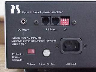 On the left side of the rear panel are the grounded AC socket (balanced designs must use this, and it is important that you don't connect any of the speaker terminals to ground), along with two RJ45 jacks for use with connecting the HCA-2 to other components (PS Audio calls it the PS Buss). Dip switches allow you to customize the communications configuration. There is also a 12 Volt DC trigger jack for automatically turning on the HCA-2 when you turn on your preamplifier.
