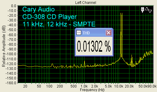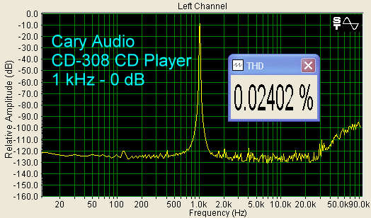 On the Bench For the CD-308 CD Player, the THD spectra from 1 kHz sine waves, as well as with 11 kHz, 12 kHz sine waves are excellent, as shown in the graphs below.