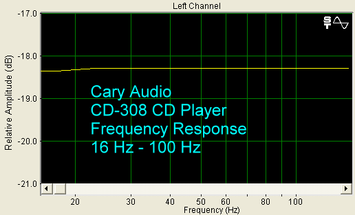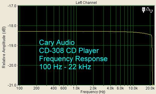 The measured frequency response of the CD-308 is within 0.25 dB, 20 Hz - 20 kHz, as shown below.