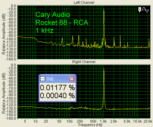 Conclusions The Cary CD-308, SLP-88, and Rocket 88 system is superb. I had a wonderful time listening to these components (and a lot of fun testing them on the bench, as if you couldn't tell from all the graphs). Tubes are not for everyone, and 40 watts are not enough for everyone, but if you like a warm lush sound, which I certainly do, I cannot recommend the Carys highly enough. They are affordable, well built, and from a company who knows how to deliver a great product.