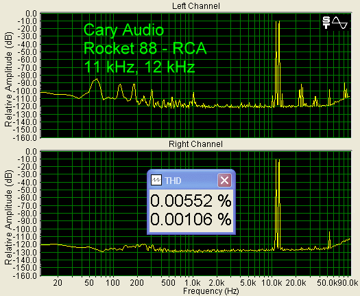 With 11 kHz, 12 kHz, shown below, using the RCA input produced a 1 kHz IM peak, but using the XLR input did not. However, the noise floor is a little higher with the XLR in this case, and that may be hiding the 1 kHz peak.