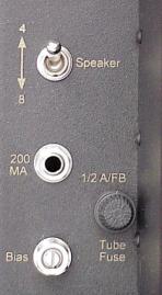 On the rear of the amplifier are two other sets of switches. One of these (one for each channel) allows you to switch the output transformer (tube power amplifiers generally use output transformers, while solid state power amplifiers in general, do not) from 4 Ohms to 8 Ohms. On the left rear (photo below, left), are the speaker impedance toggle, a phone jack for measuring bias current (placed on the grid of the output tubes), and a bias potentiometer. A phone cord is supplied, and you simply connect the cord to the amplifier jack, with the other end to a volt meter, and measure the bias current. If it is not in the correct range, you adjust it using the potentiometer. One the right rear (photo below, right) are the speaker impedance toggle for the right channel, and potentiometers to adjust the brightness of the Cat's Eye Tubes on the front. One of the eye tubes was a little brighter than the other, so I used the dials to make them the same (they are actual vacuum tubes, not LCD or other such technology).