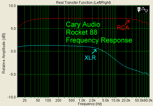 Here is one area where the RCA input performed better than the XLR input. Below are frequency response graphs for both input types. Notice that the RCA input is within 2 dB from 20 Hz - 20 kHz, while the XLR input shows significant roll-off starting at about 1 kHz, so that it is down 5 dB by 20 kHz. The SLP-88 does not have XLR outputs, so I could not use the Rocket 88 XLR inputs with it, but I did try my Balanced Audio Technology VK-5i with the Rocket 88, and used the XLR connections. The sound was a bit too rolled off at the high end for me, and did not have enough gain (remember, the Rocket 88 does not have a pre-gain stage). So, the RCA connections between the SLP-88 and Rocket 88 gave me the preferred sound anyway.