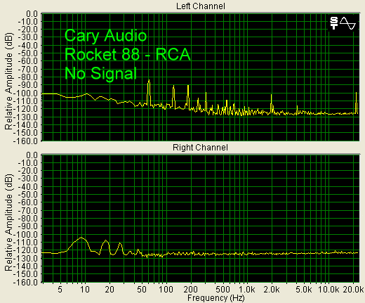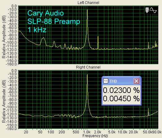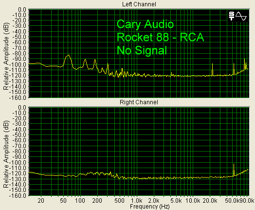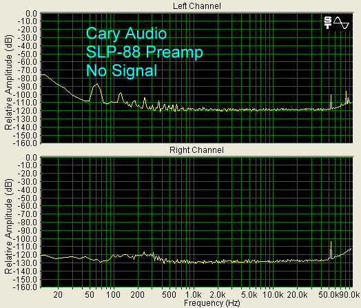 Shown below is the noise floor of the SLP-88 with no music playing. Peaks from the AC in the power supply can be seen (60 Hz, 120 Hz, 180 Hz, etc.)