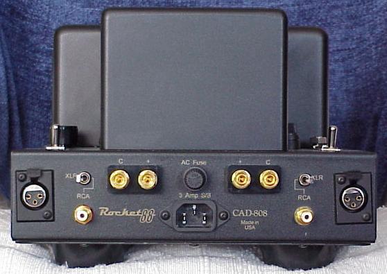 The rear panel of the Rocket 88 is shown below. At the top you can see the large power transformer, and to the left and right are the two output transformers. The Rocket 88 has XLR balanced as well as RCA unbalanced inputs, while the SLP-88 only has RCA unbalanced inputs and outputs. Some products allow you to use the RCA or XLR without having to switch between them. The Rocket 88 uses an XLR/RCA toggle for each channel.