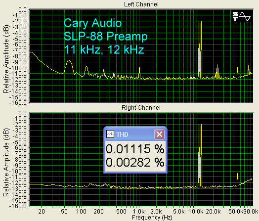 The SLP-88 Preamplifier has a higher noise floor in the mid and low bass, compared to the CD-308, but it is still quite low overall. THD with a 1 kHz input is 0.23%, and the only visible harmonic is second-order at 2 kHz. This is the kind of distortion spectrum I like to see. It means great listening. THD with 11 kHz, 12 kHz input signals is also good.