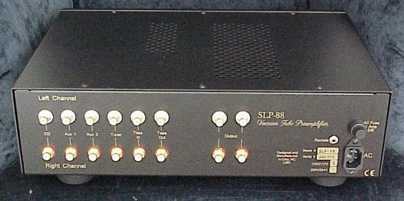 The SLP-88 front panel has On/Off, Mute, Tape Loop, Headphone On/Off (with headphone jack), and volume control. There are four sets of inputs to select from. The remote control is very simple, with adjustments for volume through the motorized volume control knob on the preamp. You can't change inputs with the preamp remote. The rear of the SLP-88 preamp is shown below. It has a full set of inputs (RCA) and two sets of outputs (RCA). The AC cord is detachable.