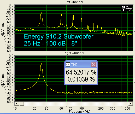 For the 10.2 subwoofer, a 25 Hz sine wave input produced a high THD at 100 dB, measured 8" from the driver. Smaller drivers pay the price, no matter what the design. If you want low THD at high SPL and low frequencies, you will need a larger subwoofer.