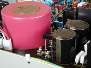 The inside of the P 3 is as well built as the outside. The power supply section has a custom wound toroidal transformer and enough capacitance to run a small receiver. The caps are Nichicon, and op-amps are Burr-Brown, which are both quality-name parts. The size of the power supply and caps impressed me, and they account for a good portion of the 16 pounds.