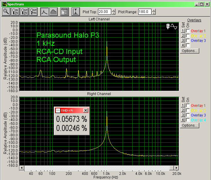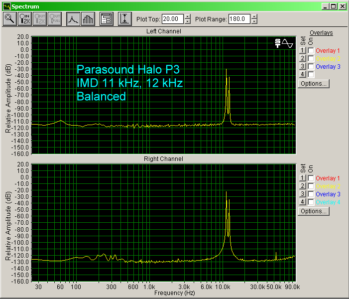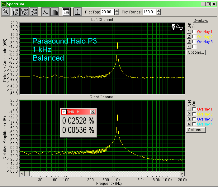 I am now happier with the sound of the P 3 and have spent a couple of weeks with the unit connected via the single-ended outputs. To generalize the sound of this preamp, I would have to call it neutral (and that is good). There is no rolloff at either end of the frequency spectrum, and it doesn't sound warm or have a tendency to be bright or harsh. Looking at the bench measurements (below) you can see there is a slightly more than 1/2 dB rolloff at 20 Hz using the single-ended outputs and a flat response using the balanced outputs. The soundstage has good depth and width and even after long listening periods I did not notice any listener's fatigue. (Listener's fatigue is when your ears start to hurt after extended listening sessions, and this plagues me sometimes especially with bright equipment.) My Paradigm Reference speakers can be a little bright when mated with certain amps and preamps, but were perfect with the P 3. The P 3 performed very well with all types of music from jazz to classic rock. It has superb imaging capabilities and a deep soundstage, although the soundstage does not extend much past the edges of the speakers. The only criticism I would make, although very minor, is vocals that should be placed in the front of the soundstage appear too high in placement.