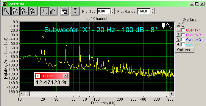 To show you how this performance ranks in comparison to other products, here is Subwoofer "X", 20 Hz, 100 dB, 8". This subwoofer has an MSRP of more than $1,000 and a very powerful amplifier. As time goes on, we will have a large database of spectra from various speakers and subwoofers for you to look at and compare.